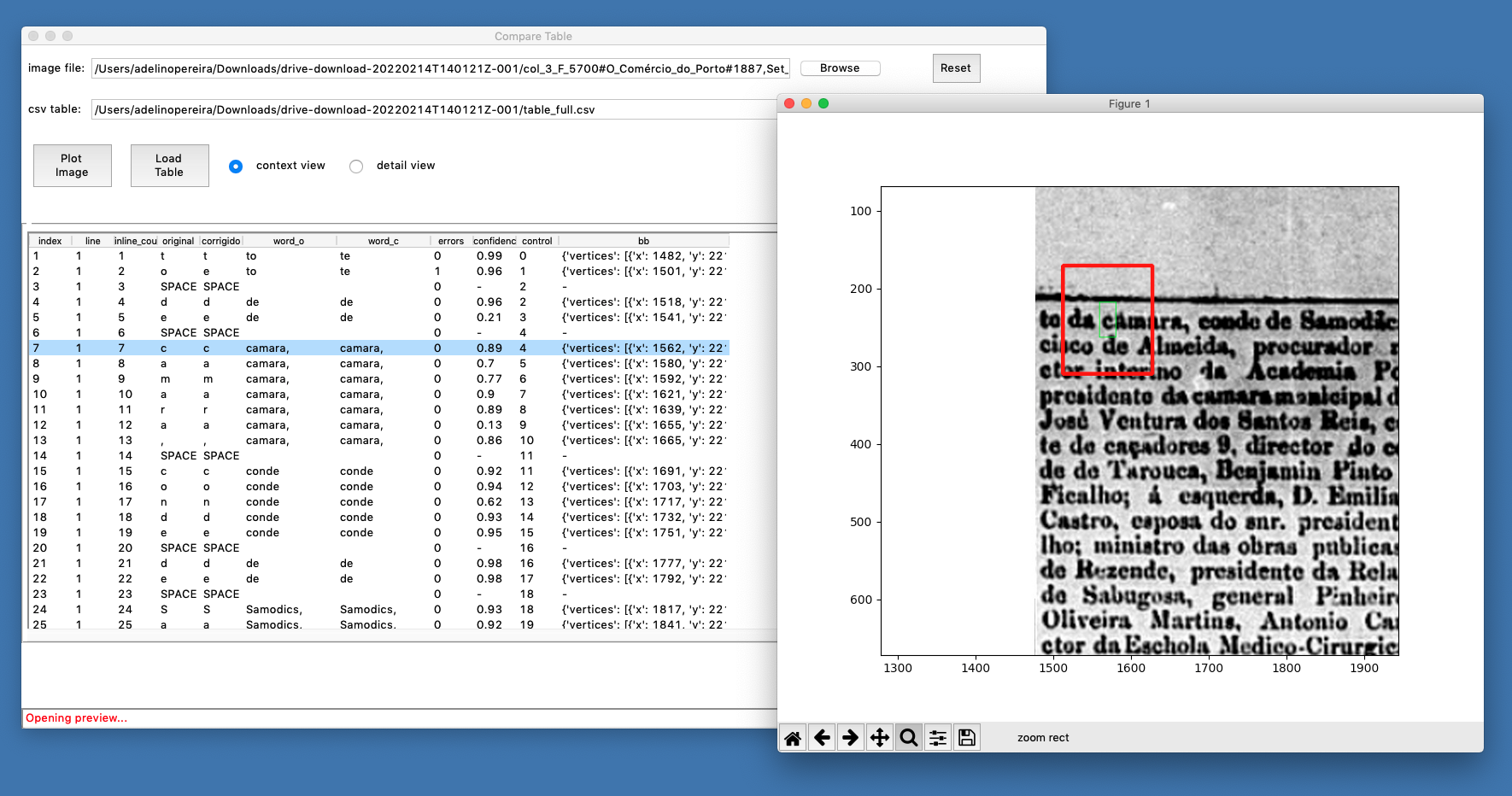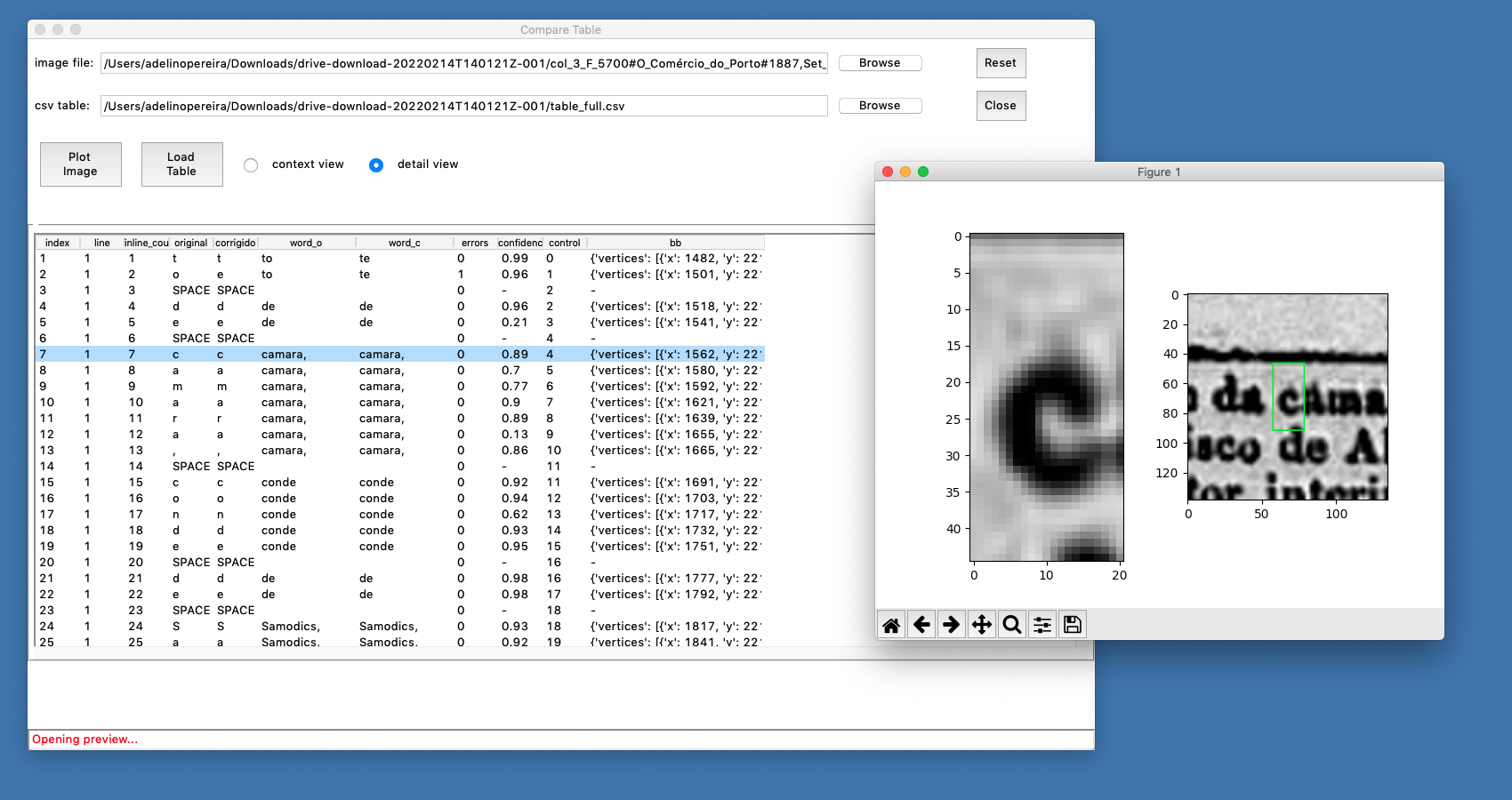 compare_tables.py - interface gráfico que permite o carregamento das tabelas geradas pelo ground_thruth.py e visualizar, clicando nas várias linhas da tabela, o carácter e a palavra e avaliar a causa do erro do reconhecimento de caracteres. Ver adiante.