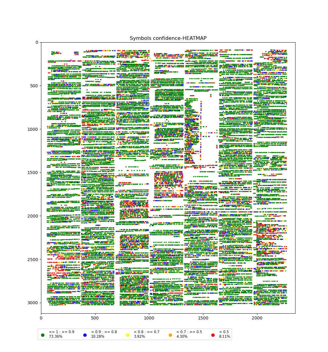 Heat-Map simbolos. Exibe uma distribuição das incidências dos caractere reconhecidos por número de confiança. -