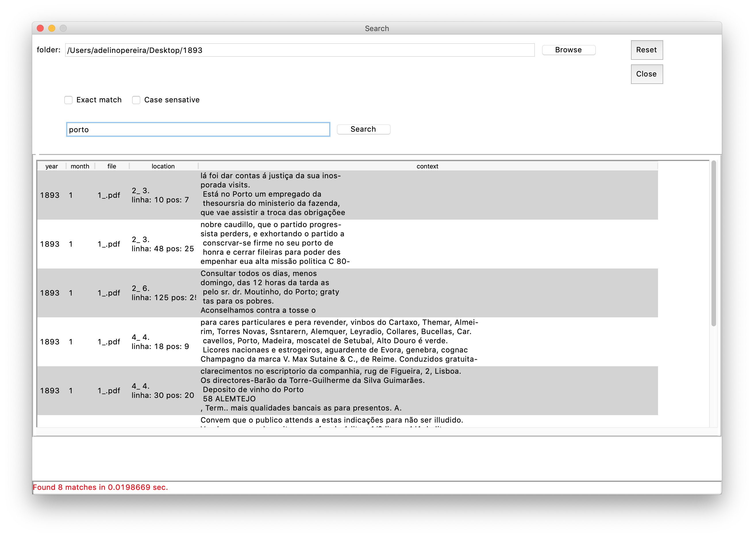 - Apresenta os resultados numa tabela onde indica respectivamente o ano, mês(dependente das nomenculaturas das pastas na estrutura dos ficheiros), o ficheiro pdf, o posicionamento do termo pesquisado no layout da página e um pequeno excerto de 5 linha que contextualiza o termo pesquisado. Clicando num dos resultados abre automaticamete o pdf correspondente.